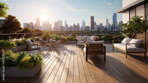 Outdoor leisure space with tables, chairs and sofas in front of large city background