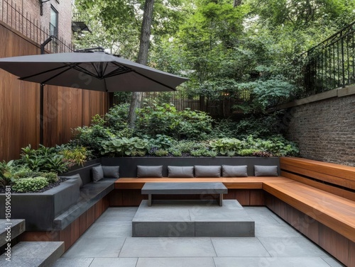 patio, seating, garden, bench, furniture, design, architecture, modern, relaxation, comfort, green, tree, lush, foliage, umbrella, shade, daylight, stone, wood, grey, cushion, table, exterior, landscaping, space, residential, backyard, home, contemporary, stylish, elegant, calmness, peaceful, zen, natural, environment, structure, built, sunlight, shadow, texture, detail, horizontal, view, perspective, composition