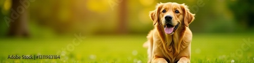 Outdoor photo of playful golden retriever enjoying nature, animal, portrait