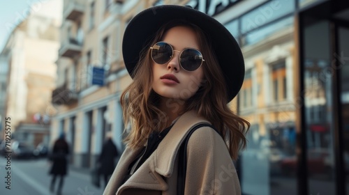 Outdoor portrait of beautiful young woman in hat, sunglasses and coat