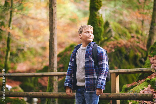 Outdoor portrait of happy kid boy hiking in autumn forest, wearing backpack