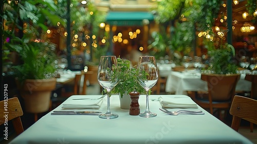eatery, table, setting, greenery, plant, wine, goggles, floral, lunch, dinner, romantic, elegant, fresh, foliage, light, warm, cosy, rustic, decor, dining, place, chic, stylish, modern, wooden, chair, potted, tableware, napkin, silverware, ambience, garden, patio, interior, blurred, sharpened, detail, view, charming, delicate, pretty, refined, sophisticated