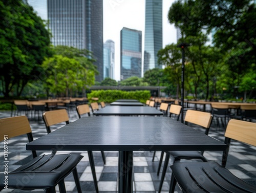 Outdoor seating area with modern tables and chairs in urban park setting, surrounded by skyscrapers and lush greenery. scene is peaceful and inviting, perfect for relaxation