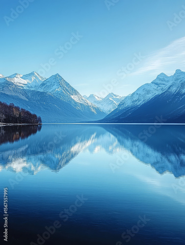 Outdoor snow-capped mountains and lake reflections, natural landscape