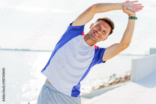 stretching, fitness, man, waterfront, sun, exercise, healthy, routine, morning, lifestyle, wellness, river, coastline, park, recreation, active, sport, happy, water, nature, leisure, well-being, body, health, movement, balance, refreshment, physical, summer, sunshine, relaxation, enjoyment, flexibility, athletic, energy, casual attire, activewear, shoreline, scenery