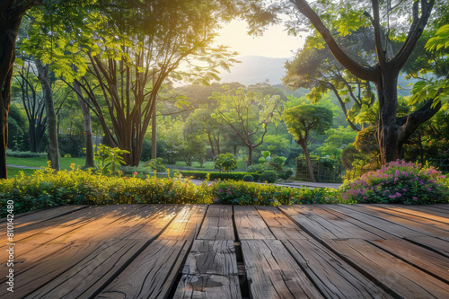 Outdoor timber decking overlooking a serene garden. AI generated.