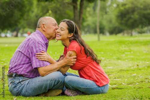Outdoor view of father kissing her daughter with love at outdoors sitting in the ground, in the park