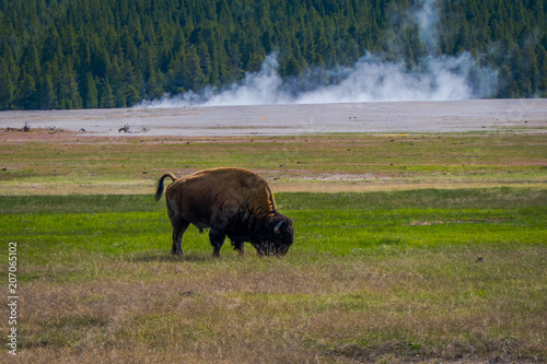 Outdoor view of huge bison animal grazing the pasture in the Yellowstone national park, Wyoming
