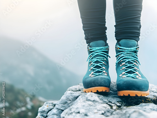 Outdoor walking boots on trail hiking on top of rocky peak panorama. Snowy mountain landscape. Climber on summit. Active lifestyle, climbing, extreme sport concept. Background travel tourism vacations