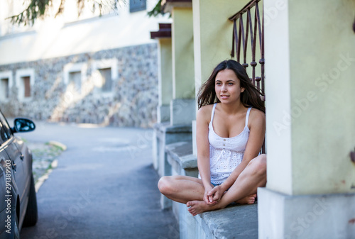 Outdoors portrait of beautiful young brunette girl sitting on street