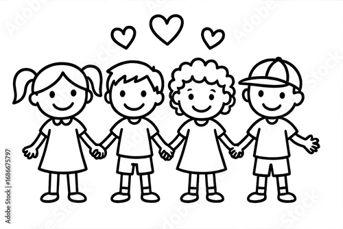friendship, children, children, holding hands, heart, oneness, love, cartoon, outline, vector, set, happy, together, connection, group, smiling, diversity, teamwork, childhood, bond, hand in hand, playtime, fun, cheerful, friendly, partnership, social, support