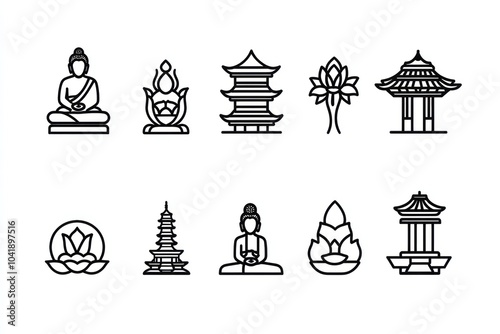 Outline icon set of Buddhism, black line, minimal, white background, ui, ux, design, app, clean fresh design