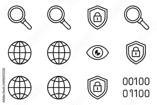 magnifying glass, search, find, discover, shield, protection, security, lock, padlock, globe, earth, cyberspace, network, eye, vision, surveillance, binary code, datum, technology, icon, symbol, outline, line art, graphic, design, digital
