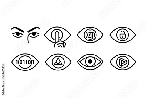outline vector icons of mystical eyes: third eye, eye in triangle, radiant eye, eye with rays, magical swirl eye, moon and eye, crystal eye, eye with stars. set of line style icons in a modern,