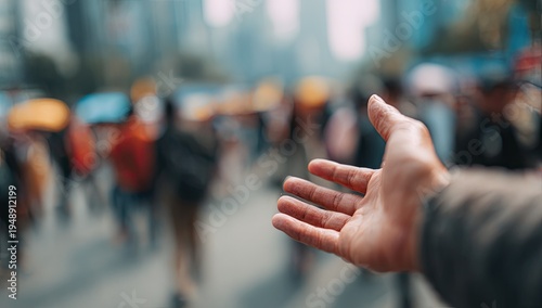 Outstretched hand reaching forward towards a blurred crowd in a city