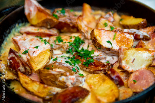 Oven baked potatoes with cream and cheese in black in a frying pan on wooden table. Close up. Tasty food.