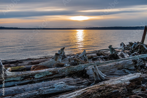 puget sound, cloud, driftwood, dusk, log, overcast, sky, sunset, water