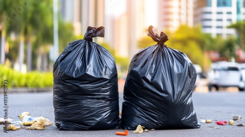 Overflowing Trash Bags Against City Skyline in Urban Environment