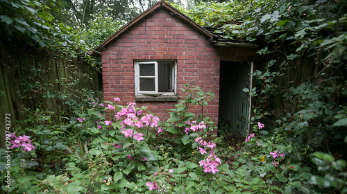 shed, overgrown, brick, garden, summer, nature, abandoned, flower, plant, house, yard, bungalow, rural, old, neglected, rustic, greenery, foliage, wildflower, landscape, outdoors, property, building, structure, vintage, hidden, secret, mystery, peace, calmness, serenity, calm, quiet, escape, retreat, solitude, countryside, timberland, backyard, farmhouse, idylli, secluded, privacy, home, exterior, green