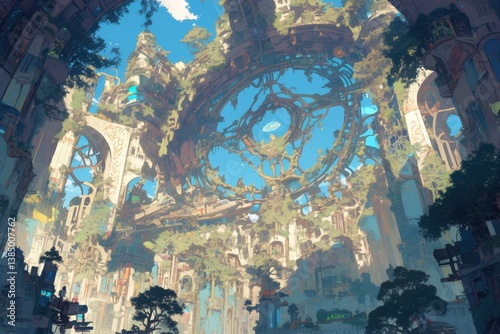 city landscape, urban, nature, growth, architecture, building, sky, blue, cloud, plant, green, fantasy, environment, tree, ruin, decay, future, utopia, overgrown, art, illustration, scenery, vista, view, travel, tour tourism, adventure, exploration, journey, discovery, calmness, serenity, peace, harmony, balance, wonder, magic, aethereal, dream, surreal, imaginative, artistic, creative, vibrant, colourful, detailed, complex, unique