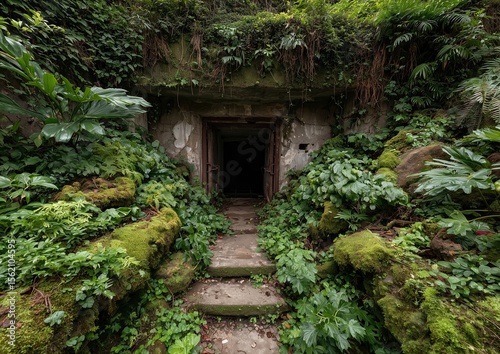 Overgrown entrance to hidden underground bunker with mossy steps, lush green plants, cracked walls and dark doorway, creating a mysterious abandoned atmosphere in dense forest, ultra-realistic details