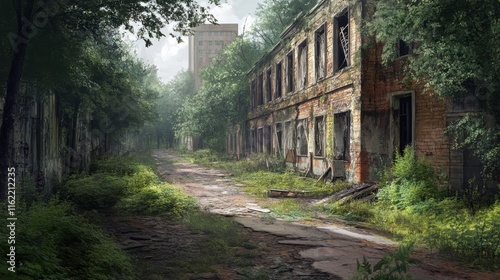 Overgrown Landscape with Abandoned Buildings and Foliage