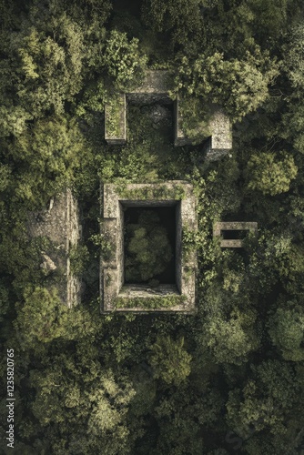 overgrown, ruin, stone, forest, tree, green, vegetation, aerial, view, nature, abandoned, wall, structure, mossy, decay, reclaimed, hidden, mystery, ancient, weathered, forgotten, solitude, tranquil, peaceful, dark, shadow, leaf, branch, wilderness, remote