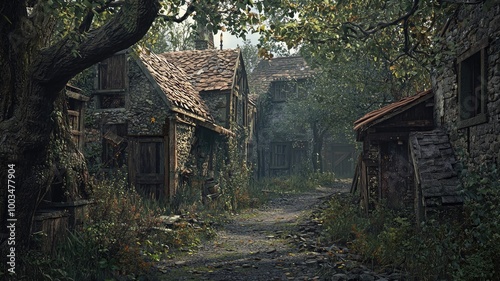 stone, house, village, overgrown, abandoned, forgotten, pathway, path, dirt, road, cobblestone, tree, foliage, leaf, branch, green, brown, grey, sky, light, shadow, window, door, roof, chimney, rustic, weathered, old, ancient, dark, mysterious, skittish, eerie, mood, atmosphere, nature, wild, peaceful, quiet