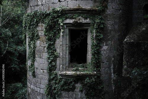stone, tower, window, overgrown, ivy, ruin, ancient, wall, brick, dark, green, leaf, plant, vegetation, mossy, old, aged, forgotten, history, mystery, derelict, abandoned, architecture, structure, castle, fortress, building, grunge, textured, detail, frame, hollow, empty, darkness, shadow, gloom, nature, forest, wood, background