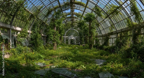 sunlight, outdoors, environment, abandoned, illumination, perspective, earthy, greenhouse, window, forgotten, overgrown, scene, structure, natural, curved, summer, vegetation, vine, vibrant, dense, old, dramatic, ruin, lush, tropical, wild, broken, neglected, daylight, growth, plant, bright, angle, glasshouse, green, dome, high, foliage, jungle, glasses, architecture, weathering, interior, conservatory, empty, decay, nature
