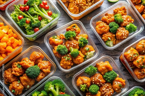 Overhead Drone Shot: Healthy Orange Chicken & Broccoli Meal Prep in Clear Containers