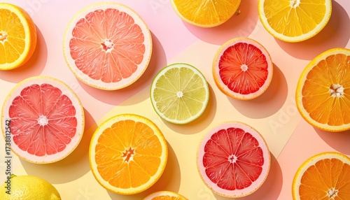 Overhead Flat Lay of Sliced Citrus Fruits on Pastel Pink and Yellow Background in Bright Lighting and High Angle View for Freshness