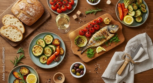Overhead shot of a beautifully arranged wooden table: artisan bread, roasted vegetables, grilled fish, olives, and a glass of white wine beside a linen napkin