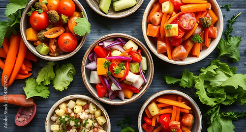 Overhead shot of a fresh vegetable appetizer spread, served in small bowls with vibrant colors