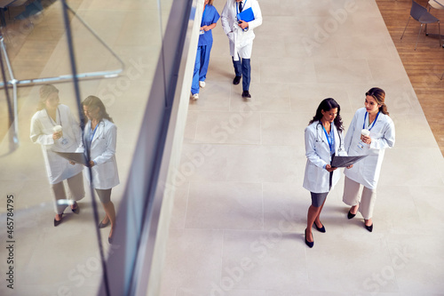 Overhead Shot Of Two Female Medical Staff In White Coats Discussing Patient Scan In Busy Hospital