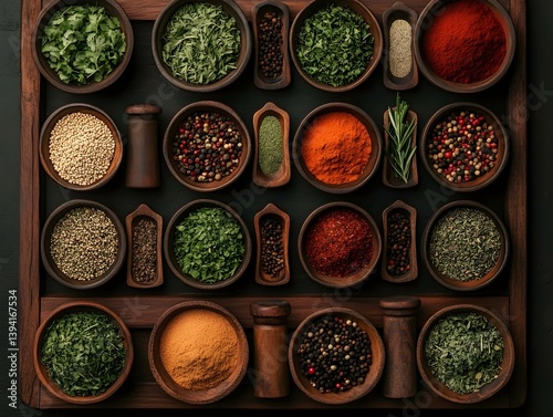 Overhead shot of various spices and herbs in wooden bowls, arranged on a dark background. Perfect for culinary blogs, recipe websites, and food packaging.
