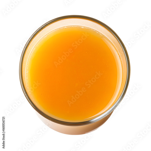 Overhead view of a glass filled with vibrant orange juice. This fresh drink is isolated on a transparent background, ideal for a png.