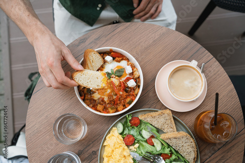 Overhead view of a man dipping bread into a bowl of shakshouka and a plate of scrambled eggs with bread and salad, a latte coffee and iced bubble coffee on the table