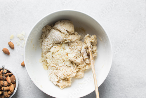 overhead view of almond biscotti dough with sliced almonds in a white bowl, almond cantucci cookie dough in ceramic mixing bowl, flatlay of biscotti cookie dough or twice baked cookies