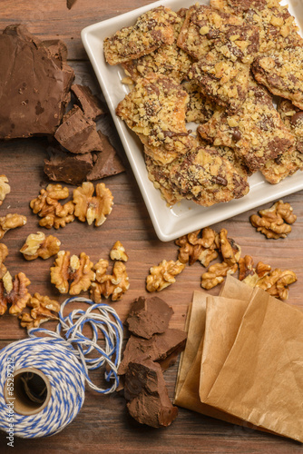 chocolate, candy, walnut, overhead, nut, parchment, twine, gift, chunk, cooking, country, crunchy, culinary, chips, dark, delicious, dessert, bricolage, food, fresh, homemade, life, paper, pile, plate, present, rustic, snack, widener, stacked, still, string, sugar, sweet, tasty, texture, toffee, view, warmth, wood, wooden, enclosed, background, baked, biscuit, breakfast, brown, cake, cookie
