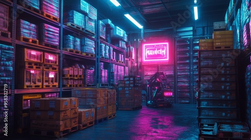 Overloaded pallets of different sizes in a cluttered warehouse, surrounded by glowing holographic labels and robotic arms organizing the chaos, Futuristic, Neon Accents