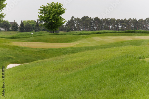 outdoors, daytime, scene, view, space, recreation, sport, game, activity, cloudy, rough, image, hole, golf, flag, lawn, overcast, picture, photograph, bunker, summer, overview, foreground, copy space, summer sport, exterior, grass, nobody, scenic, landscape, hill, color image, sand trap, color photography, golf course