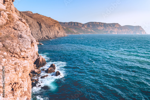 Overview of rocky steep cliffs, close and distant, and sea