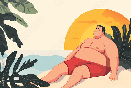 Overweight Man Relaxing on Tropical Beach at Sunset – Flat Vector Illustration