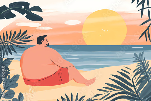 Overweight Man Relaxing on Tropical Beach at Sunset – Flat Vector Illustration