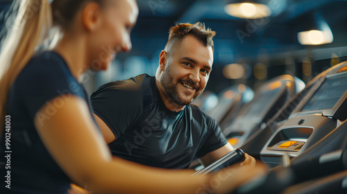 Overweight woman exercising on treadmill in gym. Personal trainer helping her