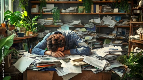 office, men at work, stress, paperwork, clutter, desk, plant, environment, chaos, fatigue, sharpened, frustration, exhaustion, document, organisation, workspace, job, burden, office supply, indoor, concentration, mess, anxiety, nature, study, sleepy, task, priority, challenge, hard work, productivity, disarray, overwork, mental health, responsibility, burnout, struggling, solution, time management