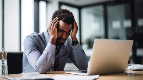 Overworked African American executive holding head in distress at office. Work pressure concept. Generative AI