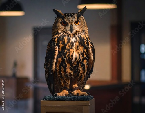 owl, bird, portrait, wildlife, nature, eye, dark, room, light, interior, sharpened, detail, feather, brown, gold, serious, nocturnal, predator, sharp, majestic, elegant, calm, still, focused, perched