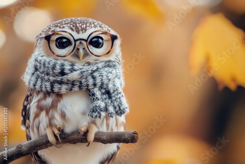 Owl wearing glasses and a scarf perched on a branch surrounded by autumn foliage in a cozy setting. Generative AI